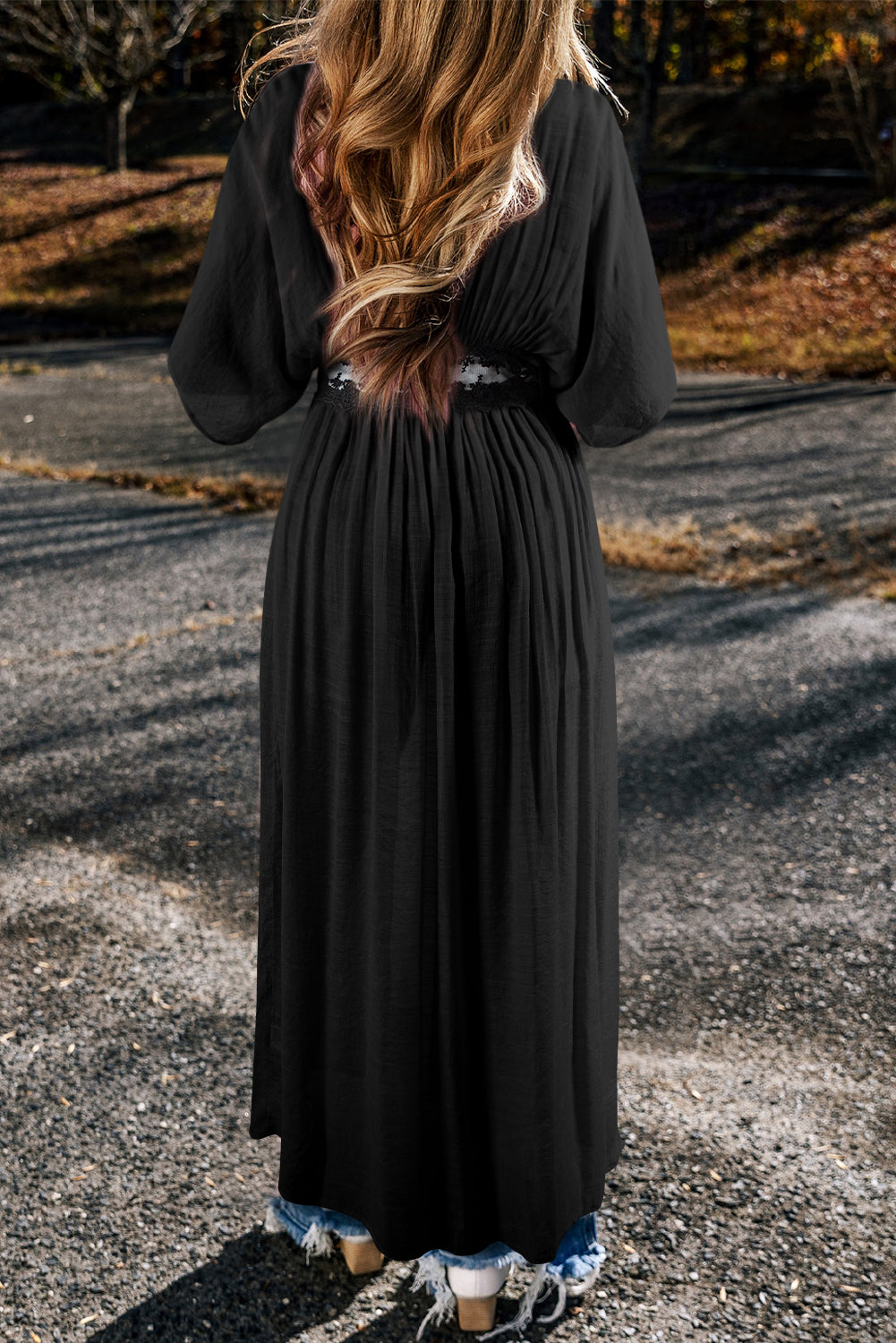 Black Lace Splicing Open Front Maxi Kimono